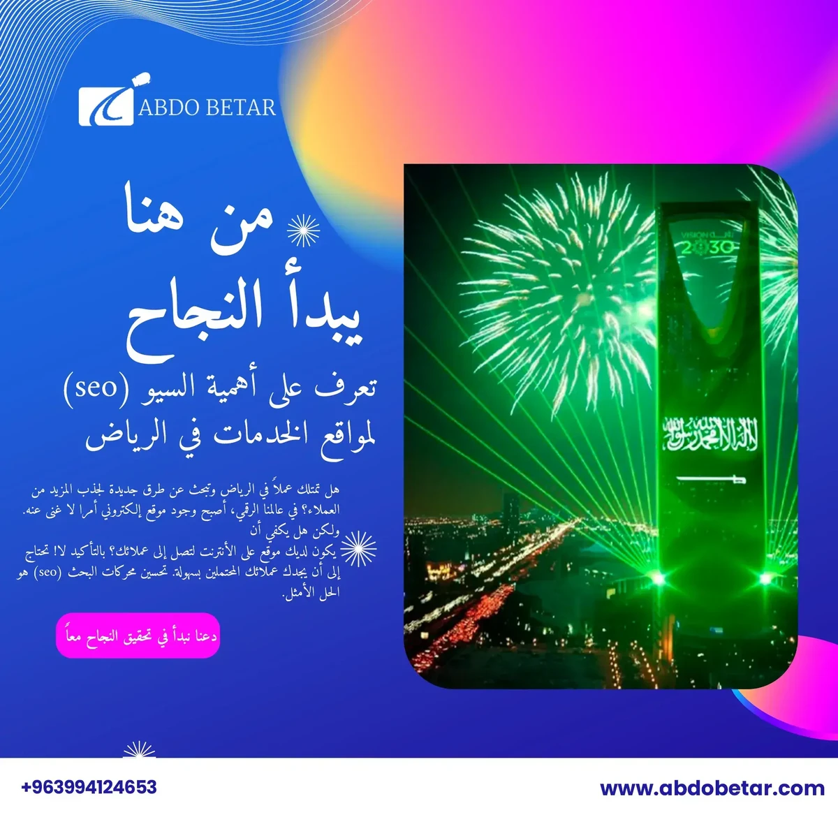 كن الأول في الرياض، و استهدف عملائك مباشرة. هل أنت مستعد لزيادة أرباح عملك في الرياض؟السيو المحلي هو الحل من خلال تحسين محرك البحث ستظهر أعمالك في أعلى نتائج البحث، هذا يعني المزيد من الزيارات لموقعك الإلكتروني،مما يعني المزيد من العملاء،و زيادة ضخمة في الأرباح.